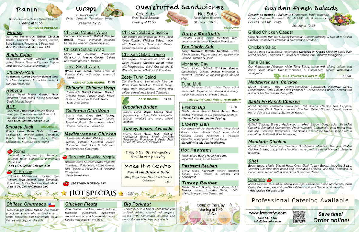 Choose from our delicious classic chicken or delicious fresco chicken salad over mixed greens, tomatoes, and cucumbers served with balsamic vinaigrette.