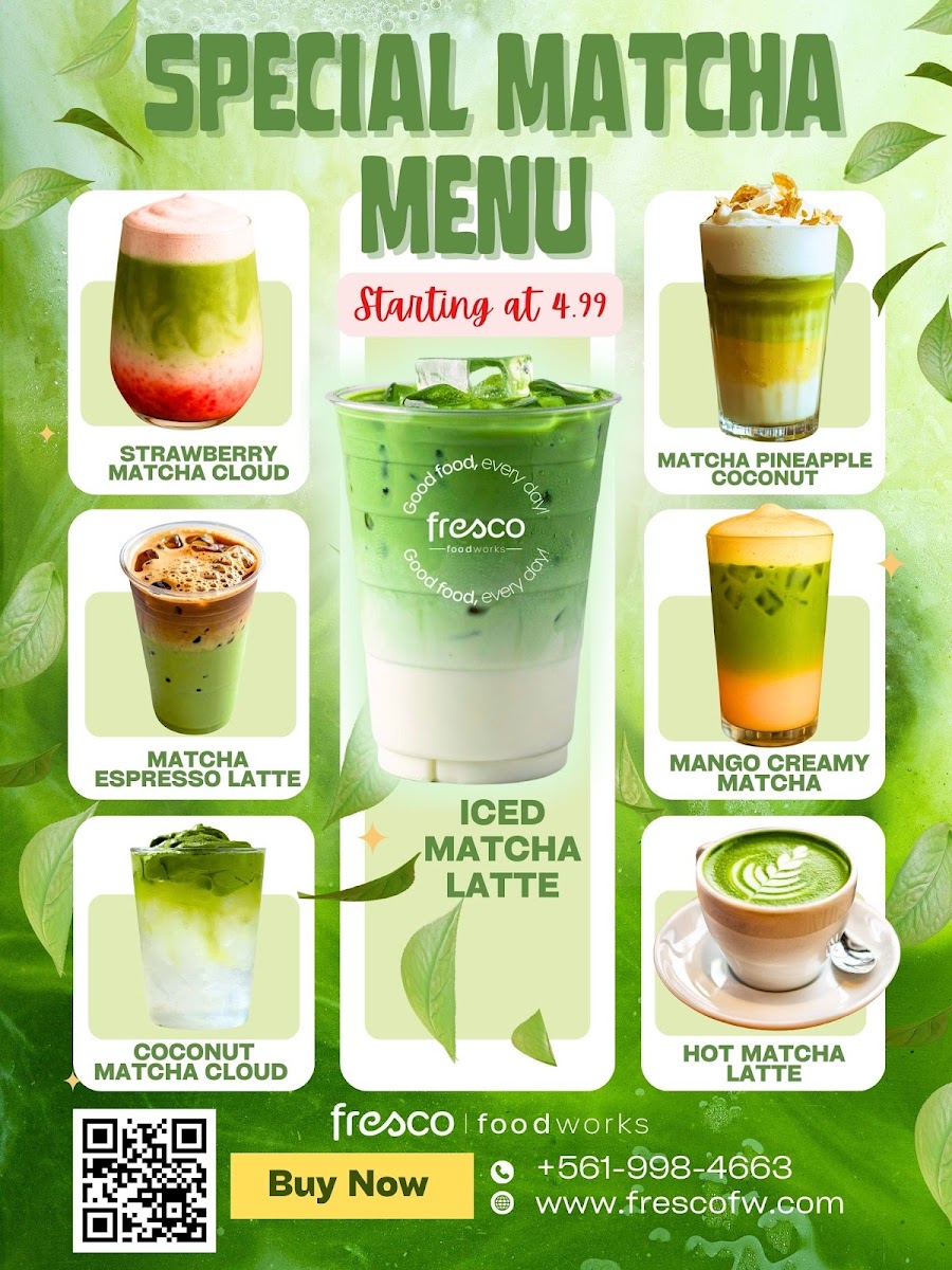 Fresco Foodworks offers a diverse and exciting menu, perfect for satisfying a variety of cravings at any time of the day. For coffee lovers, the selection includes Fresh Ground Premium Coffee in both medium and large sizes, Espresso (Med and Lg), and a frothy Cappuccino (Med). For those preferring something with a bit more flavor, the Matcha options are impressive, such as the smooth Matcha Latte (16 oz), tropical Matcha Pineapple Coconut, and indulgent Mango Creamy Matcha, with unique offerings like the Strawberry Matcha Cloud and Matcha Espresso Latte.