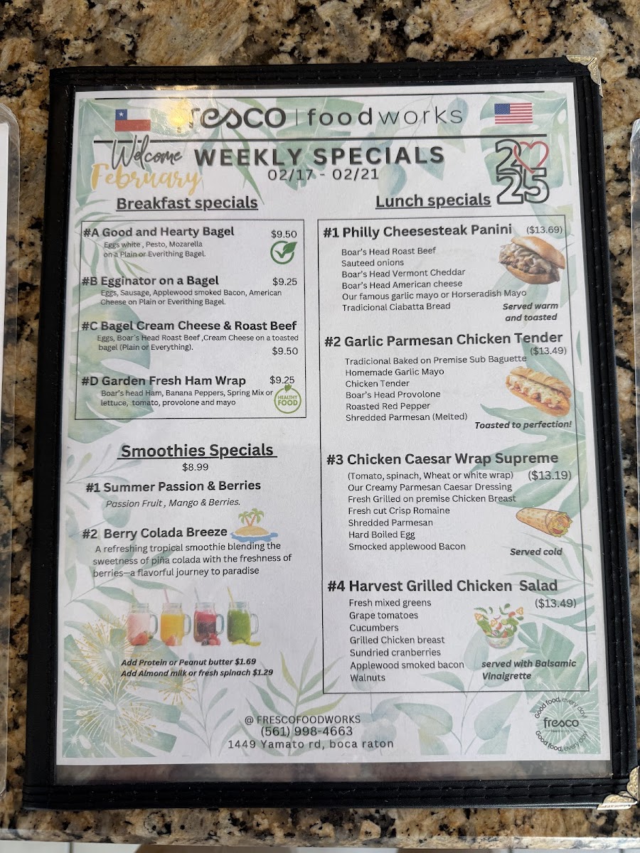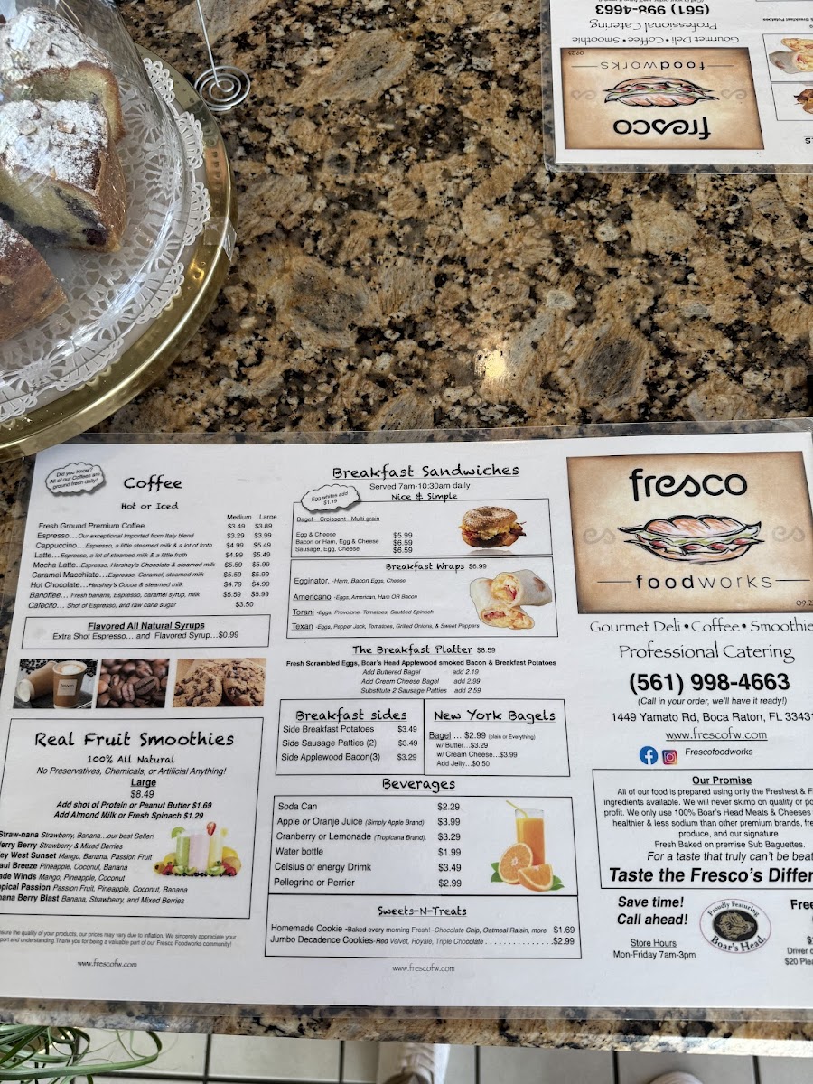 In addition to the main menu, Fresco Foodworks offers Weekly Specials that include breakfast, lunch, and smoothie options, giving guests the chance to try something new each week. For sides, there's a choice of Mac Salad, Potato Salad, and Coleslaw Salad, and for those with a sweet tooth, there are treats like Zucchini Walnut Bread (Veg) and Apple Crumble Muffin.