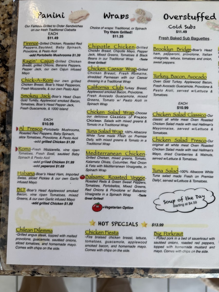 The wrap section includes some flavorful choices such as the Chipotle Chicken Wrap, Chicken Caesar Wrap, and the fresh California Club Wrap. For something lighter, the Chicken Salad Wrap and Tuna Salad Wrap provide a healthy alternative. In addition, the sub menu features delicious cold options like the Brooklyn Bridge Sub, Turkey, Bacon, Avocado Sub, and the Chicken Salad Classico Sub, as well as hot specials such as the Chilean Churrasco and Big Porkraut.